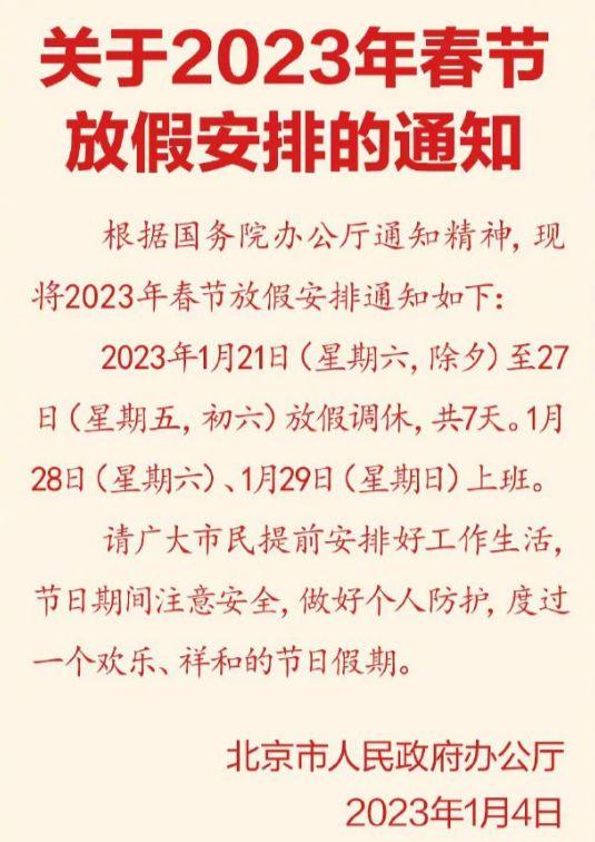 1月4日,北京市人民政府辦公廳發(fā)布《關于2023年春節(jié)放假安排的通知》(以下簡稱《通知》)。《通知》指出,根據國務院辦公廳通知精神,現(xiàn)將2023年春節(jié)放假安排通知如下:2023年1月21日(星期六,除夕)至27日(星期五,初六)放假調休,共7天。1月28日(星期六)、1月29日(星期日)上班。
