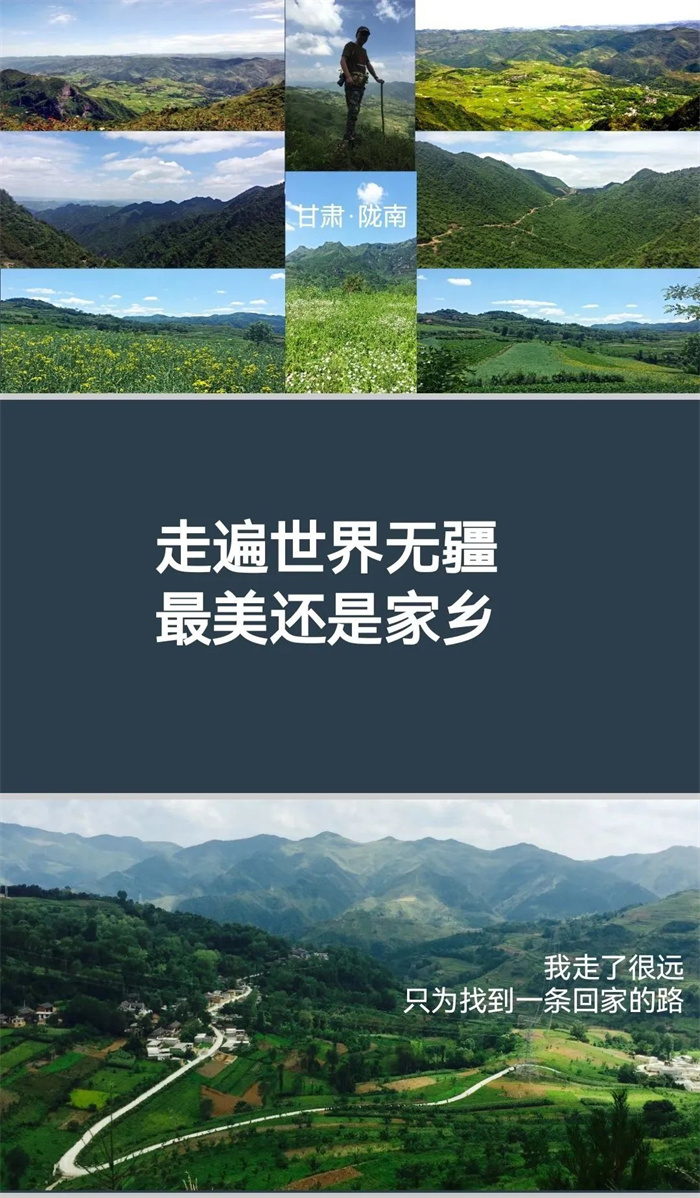 我每次回到西北各省區(qū)參加活動,做演講分享時,總會放幾頁P(yáng)PT介紹我的家鄉(xiāng)——大隴南,配圖都是我拍攝的我們村莊附近的風(fēng)光,也經(jīng)常說一句話——“走遍世界無疆,最美還是家鄉(xiāng)”,不辭長作隴南人。