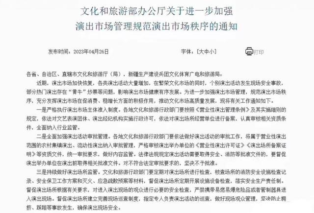 近日,文旅部辦公廳發(fā)布《文化和旅游部辦公廳關(guān)于進(jìn)一步加強演出市場管理規(guī)范演出市場秩序的通知》。通知提到,對臨時搭建舞臺、看臺的演唱會、音樂節(jié)等大型演出活動,文化和旅游行政部門要做好演出現(xiàn)場監(jiān)管,查驗演出舉辦單位的演出批準(zhǔn)文件及相關(guān)手續(xù),核驗演員信息及演出節(jié)目內(nèi)容,嚴(yán)禁擅自變更演員及演出內(nèi)容,嚴(yán)禁假唱、假演奏等違法違規(guī)行為。
