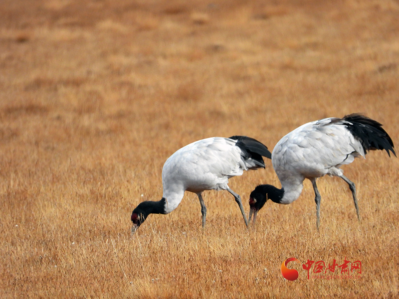 中國甘肅網10月17日訊 (西北角·中國甘肅網記者 張慧雅)近日,甘肅祁連山國家級自然保護區(qū)工作人員在轄區(qū)巡護時偶遇國家一級保護野生動物黑頸鶴歇息覓食的場景,兩只黑頸鶴漫步在一處濕地中一邊欣賞美景一邊享用美食。