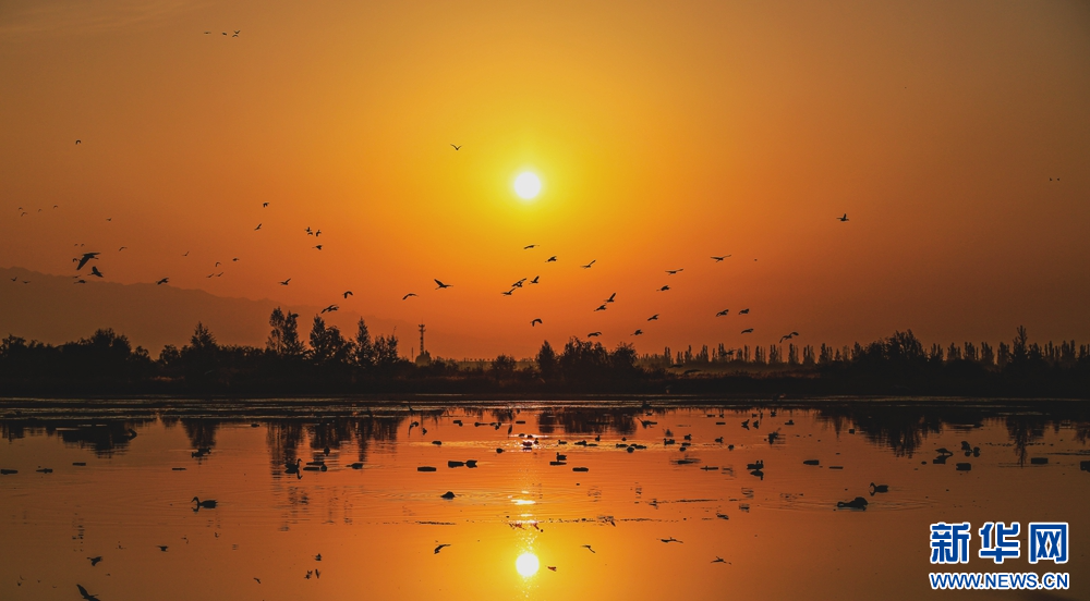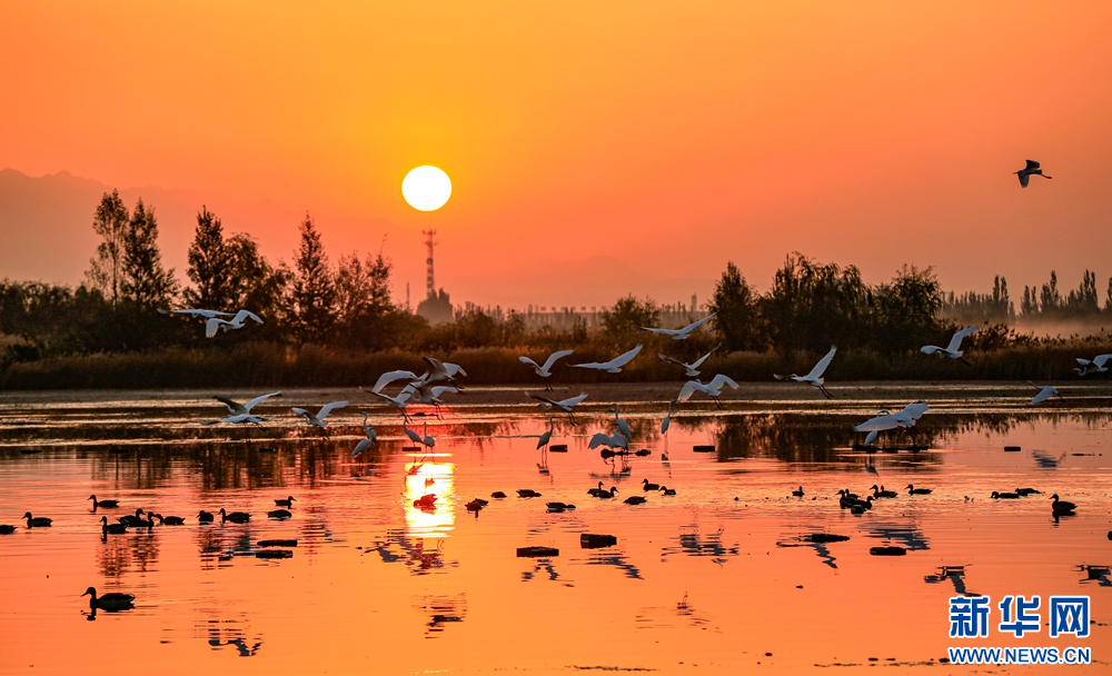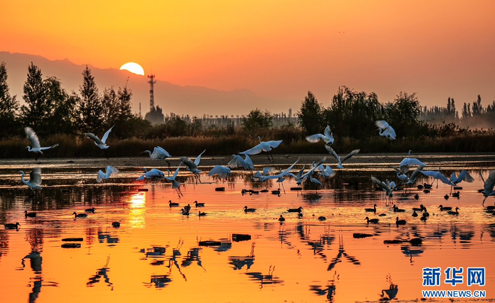 近日,在甘肅省張掖國家濕地公園,成群的白鷺迎著朝陽悠然自得地飛翔、覓食、嬉戲,構成了一幅朝陽伴鷺飛的美麗畫卷。新華網發(fā)(陳禮 攝)