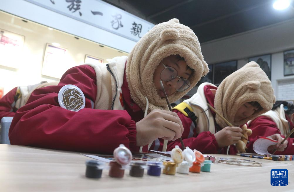 1月17日,在甘肅敦煌莫高里工匠村研學(xué)課堂,研學(xué)團(tuán)隊(duì)學(xué)員學(xué)習(xí)臨摹敦煌壁畫。新華社發(fā)(張曉亮 攝)
