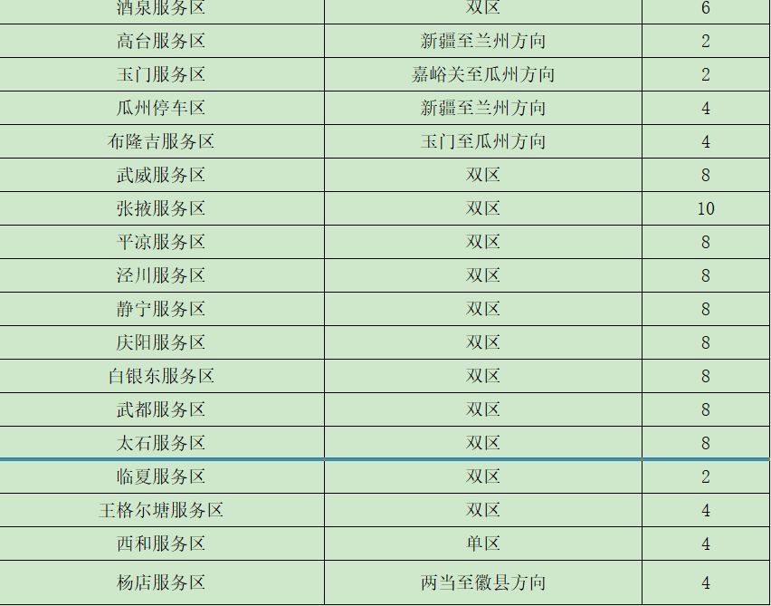 ?。ǘ┲攸c(diǎn)客運(yùn)車站班線。省內(nèi)二級(jí)及以上客運(yùn)站正常營(yíng)運(yùn),以省會(huì)城市、人口密集市縣的站點(diǎn)及之間的班線為重點(diǎn)。如:蘭州客運(yùn)東站、南站,天水汽車站等站點(diǎn)以及蘭州—定西、蘭州—西峰、臨洮—平川、舟曲—武都、金昌—武威等客運(yùn)班線。 (三)車流量較大服務(wù)區(qū)。預(yù)計(jì)我省車流量較大服務(wù)區(qū)為定西服務(wù)區(qū)、酒泉服務(wù)區(qū)、武威服務(wù)區(qū)、高臺(tái)服務(wù)區(qū)、長(zhǎng)城驛服務(wù)區(qū)、靜寧服務(wù)區(qū)、會(huì)寧服務(wù)區(qū)、太石服務(wù)區(qū)、蘭州北服務(wù)區(qū)、接駕嘴服務(wù)區(qū)、永登服務(wù)區(qū)。