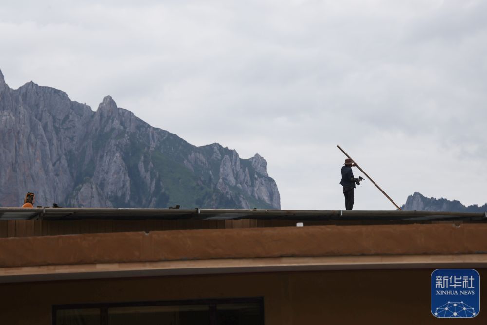 ↑ 工人在扎尕那景區(qū)一家正在裝修的民宿房頂施工(6月27日攝)。新華社記者 方欣 攝