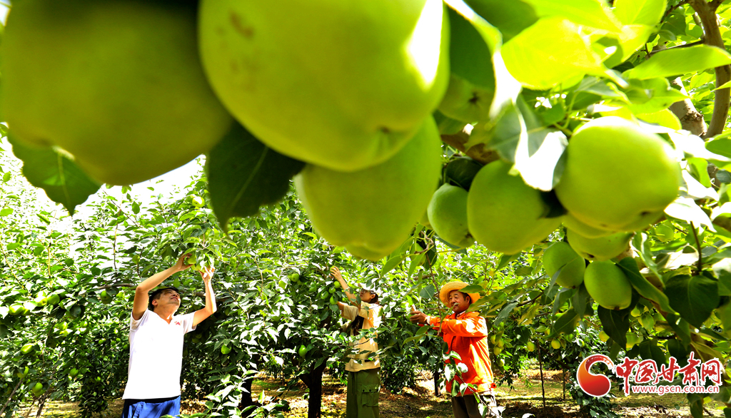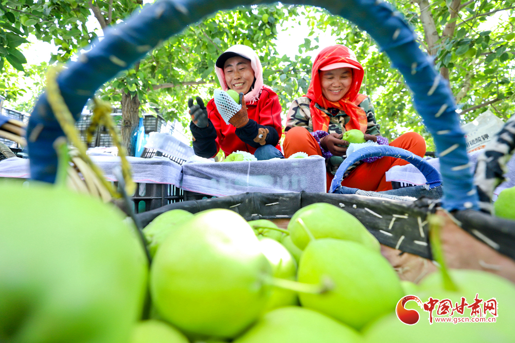 8月12日,在張掖市甘州區(qū)農(nóng)墾張掖農(nóng)場(chǎng)綠色果品種植基地,果農(nóng)們正在采摘成熟的早酥梨,基地里一派果豐人忙的喜人景象。