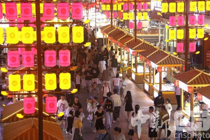 2024年8月17日,游客在甘肅省敦煌夜市游覽。進(jìn)入暑期以來(lái),被譽(yù)為敦煌“夜景圖”的敦煌夜市日均客流量達(dá)3萬(wàn)人次以上,游客在這里賞景游覽休閑,品嘗地方名優(yōu)小吃,選購(gòu)敦煌特色文創(chuàng)產(chǎn)品,感受敦煌文化魅力,夜經(jīng)濟(jì)活力四射。中新社發(fā) 張曉亮 攝