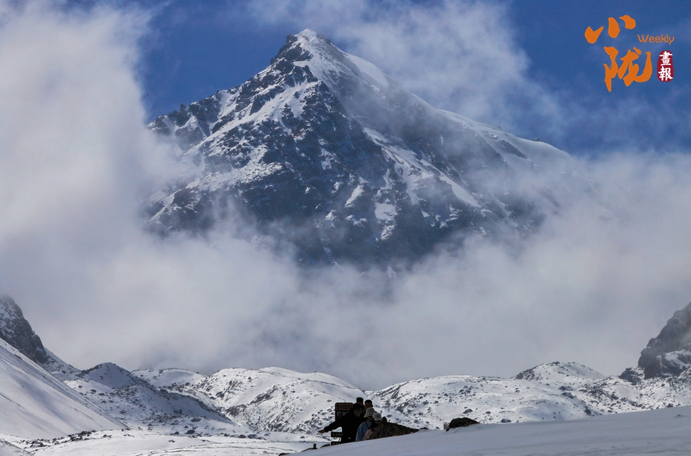 雪山山巒間,云霧回旋飄動,彌漫舒展,如海浪起伏、波濤滾滾一般,與湛藍(lán)天空相互映襯,壯美如畫。