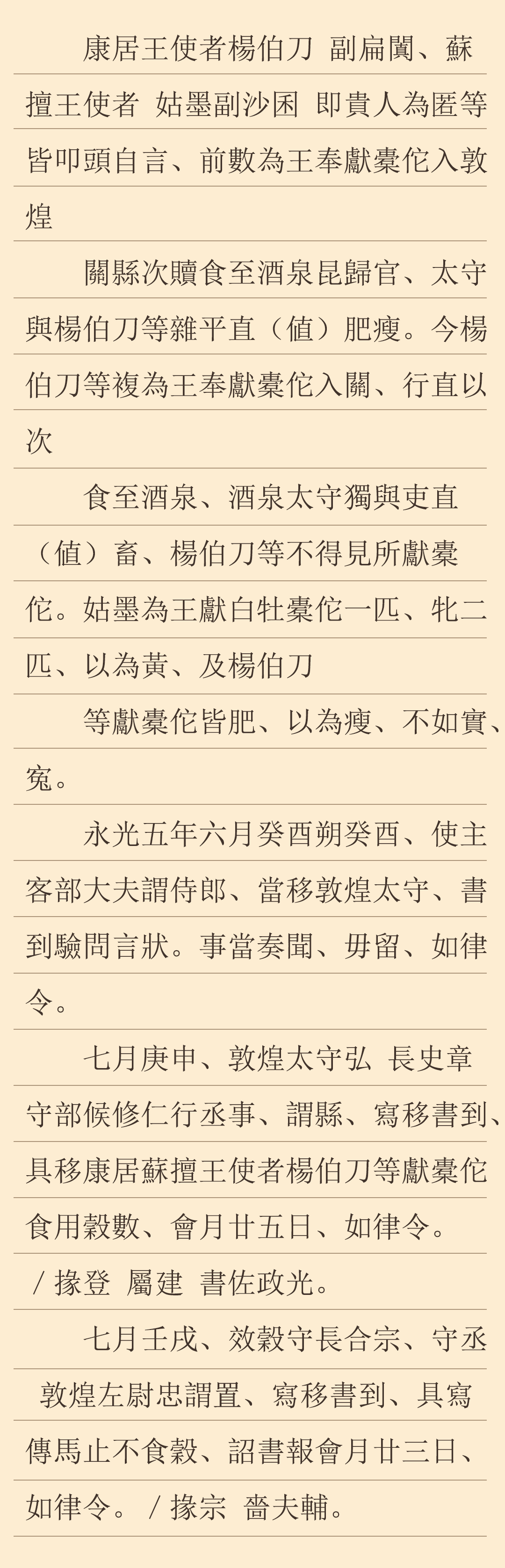 永光五年六月初一日(公元前39年7月21日),朝廷主管對外交往和蠻夷事務(wù)的使主客諫大夫行文敦煌,要求敦煌太守接到文件后對此進行查詢并按時上報中央,不得留遲。七月庚申(9月6日),敦煌大守弘、長史章以及兼行丞事的守部候修仁聯(lián)署文件,下發(fā)效谷縣,要求縣廷接到文件后,將康居王使者路過縣境時為之提供的谷物數(shù)量,在七天之內(nèi)上報太守府。文書中有發(fā)文時掾、屬、書佐的具名。