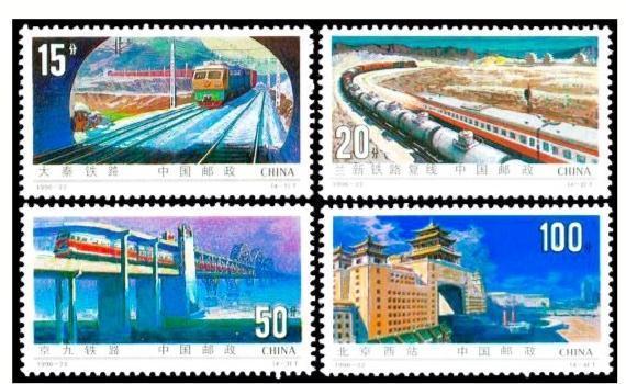 1996年9月,我國(guó)發(fā)行編號(hào)為1996-22的《鐵路建設(shè)》郵票一套四枚,其中T4-2圖為蘭新鐵路復(fù)線(xiàn)。票面上,一貨一客兩列火車(chē)蜿蜒在蘭新鐵路復(fù)線(xiàn),氣勢(shì)如虹。而嘉峪關(guān)關(guān)城作為一個(gè)地理標(biāo)志,被處理成蘭新鐵路復(fù)線(xiàn)的背景圖案,放在郵票主圖的后方。盡管由于票面所限,背景圖案上的嘉峪關(guān)關(guān)城畫(huà)面很小,無(wú)以淋漓盡致地表現(xiàn)嘉峪關(guān)城樓的細(xì)節(jié),但其“天下第一雄關(guān)”的雄姿絲毫不減。而嘉峪關(guān)出現(xiàn)在表現(xiàn)甘肅特色乃至蘭新交通主線(xiàn)的票面上,也足見(jiàn)其地理位置的重要性。