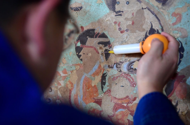 工作人員在修復(fù)出現(xiàn)病害的壁畫。記者 杜哲宇 攝