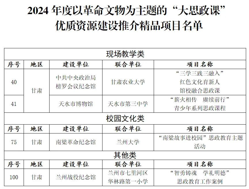 其中,甘肅省4項案例入選。分別是,中共中央政治局榜羅鎮(zhèn)會議紀(jì)念館、甘肅農(nóng)業(yè)大學(xué)“三學(xué)三踐三融入”紅色文化育新人館校融合思政課;天水市博物館、天水市第三中學(xué)“薪火相傳 賡續(xù)前行”青少年系列思政課程;南梁革命紀(jì)念館、蘭州大學(xué)“南梁故事進(jìn)校園”思政教育主題活動;蘭州戰(zhàn)役紀(jì)念館、蘭州市七里河區(qū)華林路第一小學(xué)“智勇鑄魂 學(xué)禮明德”思政教育工作案例。