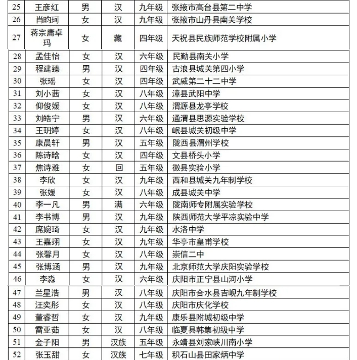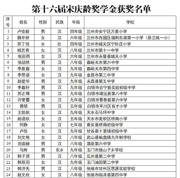 日前,經(jīng)地方各級教育行政部門推薦,第十六屆宋慶齡獎學(xué)金獲獎名單公布,全國共有1542名學(xué)生獲獎,其中甘肅56人。