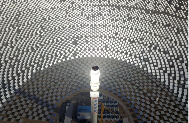 人們驚呼,這是自然力與人類智慧的完美創(chuàng)造:戈壁荒灘上“種”出了人造太陽。這個(gè)100兆瓦熔鹽塔式光熱電站,占地面積相當(dāng)于780個(gè)足球場(chǎng),每年所生產(chǎn)的綠電可減排35萬噸二氧化碳。