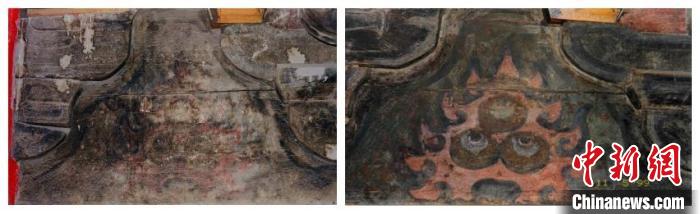 圖為1999年拍攝的長(zhǎng)樂(lè)門(mén)內(nèi)檐彩畫(huà)顏料層顯色加固前后對(duì)比。(陜西師范大學(xué)歷史文化遺產(chǎn)保護(hù)教育部工程研究中心供圖)