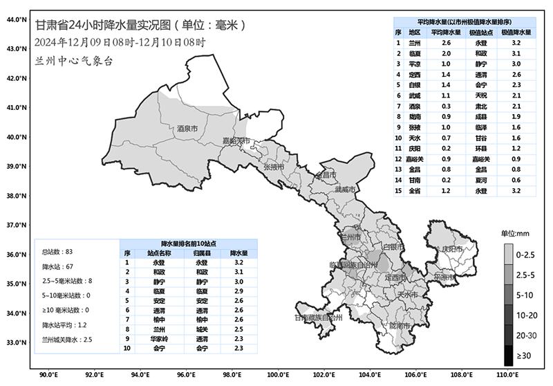 中國(guó)甘肅網(wǎng)12月10日訊(西北角·中國(guó)甘肅網(wǎng)記者 沈文剛)12月9日8時(shí)至12月10日8時(shí),全省共計(jì)67個(gè)縣區(qū)出現(xiàn)降雪,其中蘭州南部、臨夏南部、平?jīng)鑫鞑?、定西東部局部地方出現(xiàn)中雪。目前,較大累積降雪量出現(xiàn)在永登3.2mm、和政3.1mm、靜寧3.0mm、臨夏2.9mm、通渭2.6mm。蘭州本站降水2.5mm。