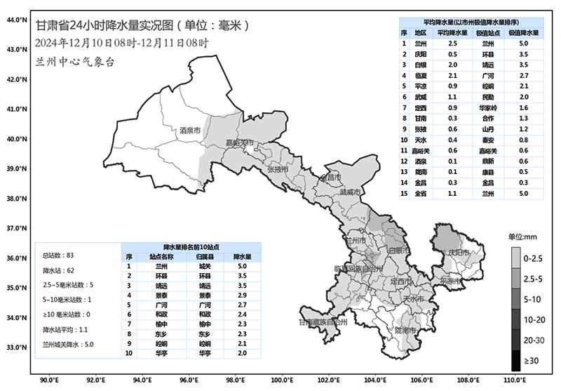 中國甘肅網(wǎng)12月11日訊(西北角·中國甘肅網(wǎng)記者 沈文剛)12月10日8時至12月11日8時,全省共計62個縣區(qū)出現(xiàn)小雪,其中蘭州主城區(qū)出現(xiàn)大雪,慶陽北部、白銀中部和北部、臨夏西南部出現(xiàn)中雪。較大降水量出現(xiàn)在蘭州本站5.0mm、靖遠(yuǎn)3.5mm、環(huán)縣3.5mm、景泰2.9mm、廣河2.7mm。
