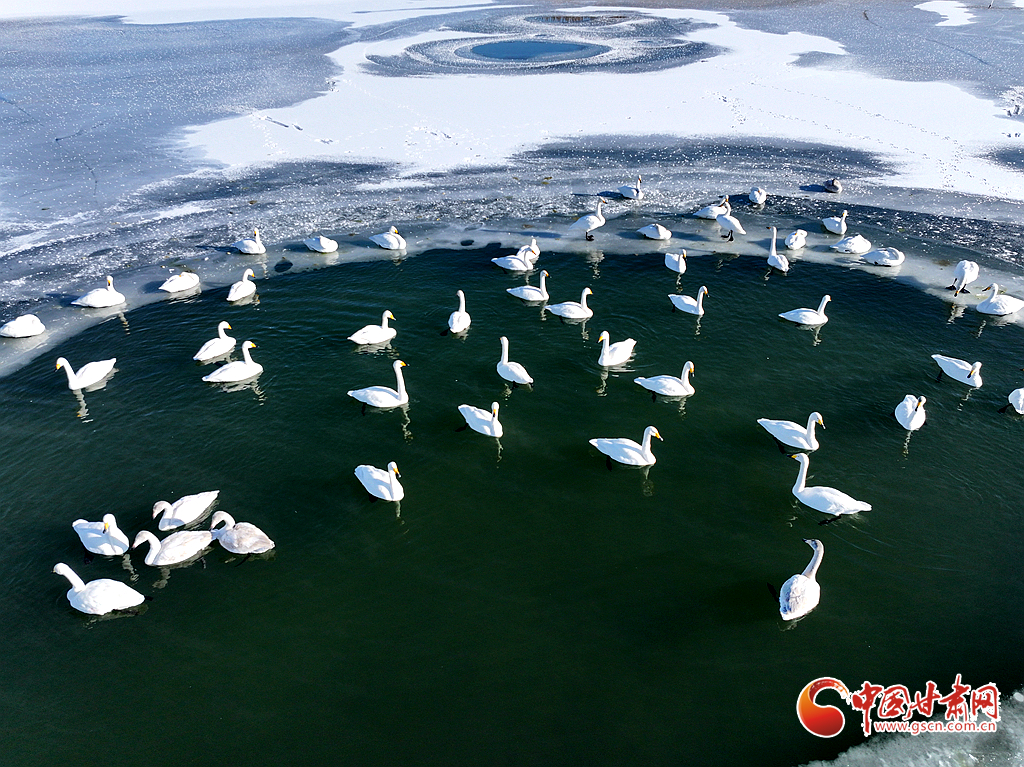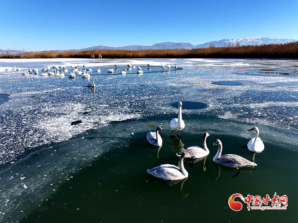 近日,在甘肅省張掖國家濕地公園,成群的越冬天鵝在冰封的湖面上悠然覓食、嬉戲,構(gòu)成了一幅動(dòng)人的生態(tài)畫卷,成為冬日里一道尤為引人注目的風(fēng)景線。