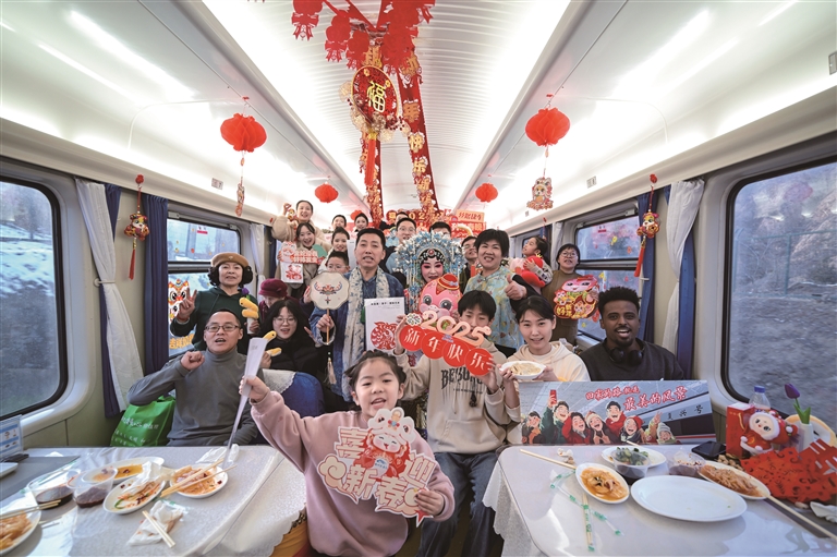 在歌聲、鼓聲、歡笑聲中,出鍋的餃子讓跨年列車(chē)的車(chē)廂年味更濃,把“春運(yùn)回家”這一樸素而又濃烈的幸福感,通過(guò)舌尖味蕾傳遞,把“團(tuán)圓便是年”“回家的路就是最美的風(fēng)景”,通過(guò)餃子這一代表著中國(guó)人情愫強(qiáng)烈的文化符號(hào),將天南海北奔赴山海的人們團(tuán)聚在列車(chē)、歡度在旅途。