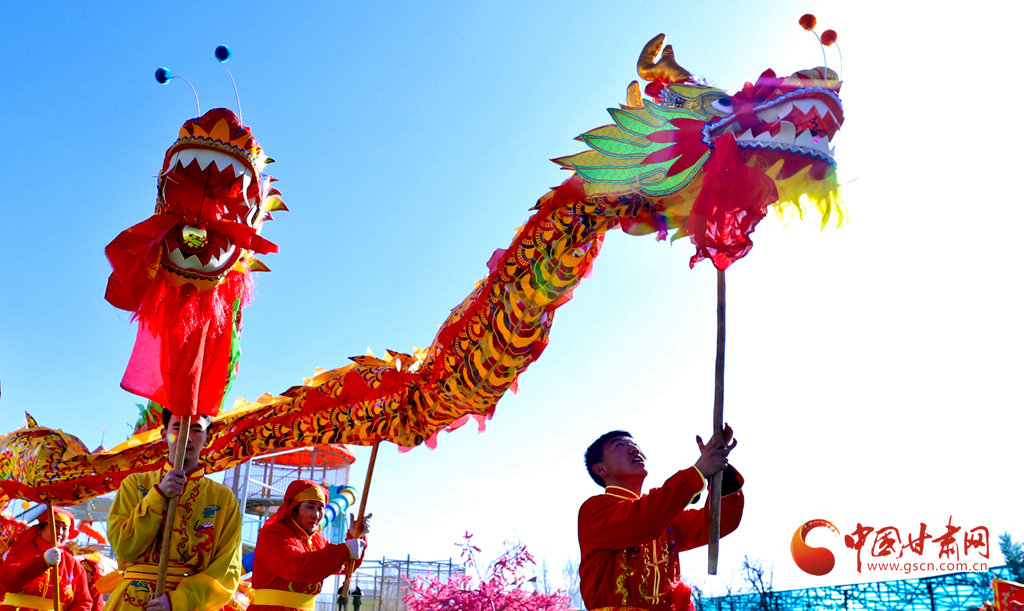 春節(jié)期間,甘肅省張掖市甘州區(qū)一游樂(lè)園內(nèi)熱鬧非凡,張掖云海民俗文化藝術(shù)團(tuán)的演員們舞起祥龍雄獅、敲起威風(fēng)鑼鼓,讓市民和游客在傳統(tǒng)民俗文化的氛圍中歡度春節(jié)假期。