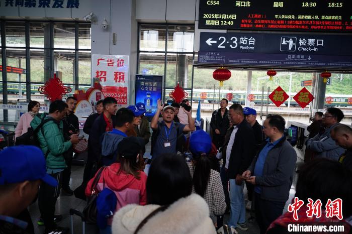 3月16日,云南省紅河州河口縣河口北站,一位導游組織越南旅游團候車。中新社記者  劉冉陽  攝